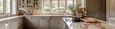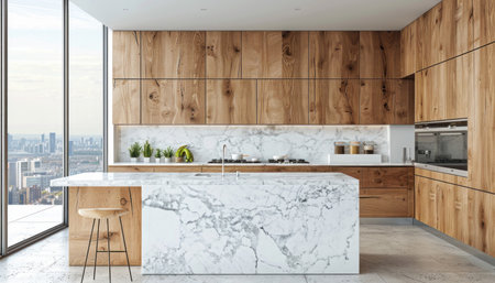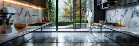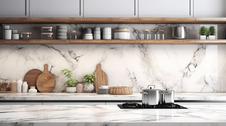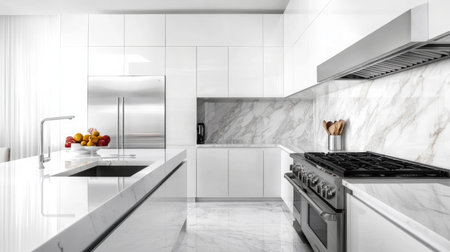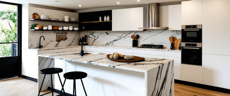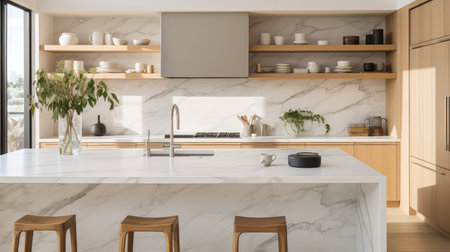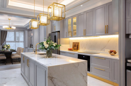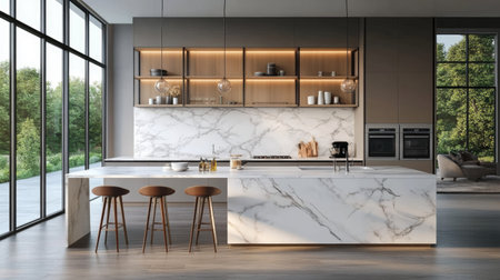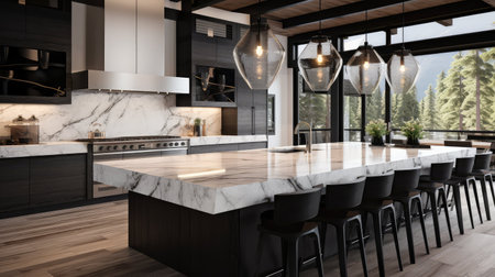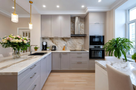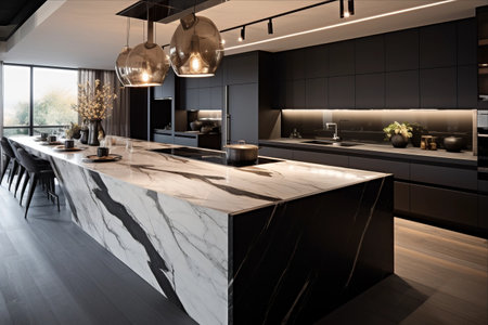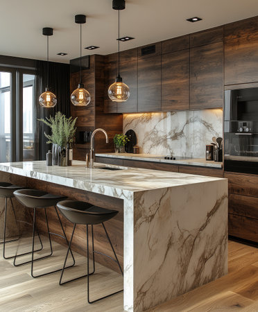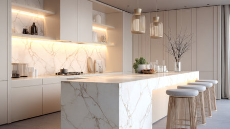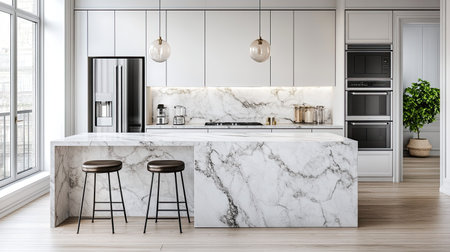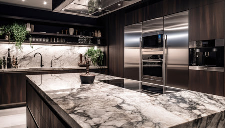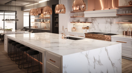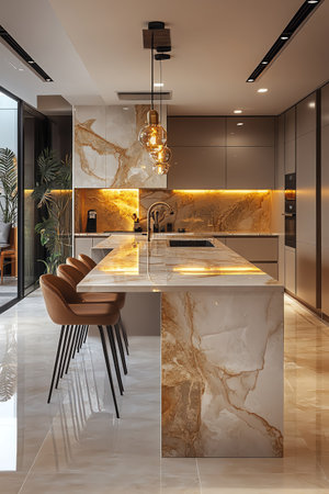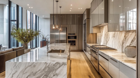 Luxurious kitchen interior with marble countertops, high-end appliances, and a sleek design in a modern apartment, combining elegance and practicality