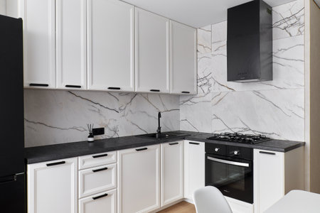 interior of modern kitchen with white marble and black granite countertop