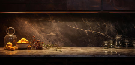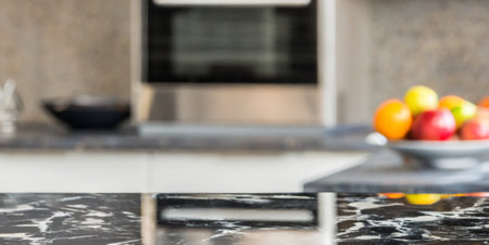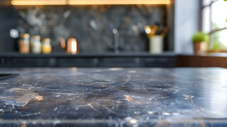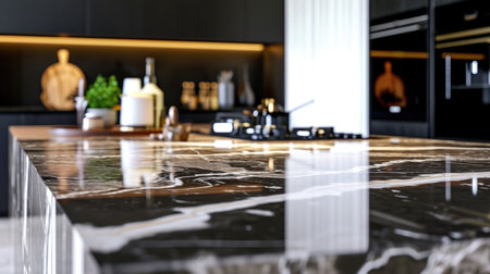 Close-up showcases a sleek, dark marble countertop in a modern kitchen setting, subtly displaying the blurred background of kitchen accessories and lighting.