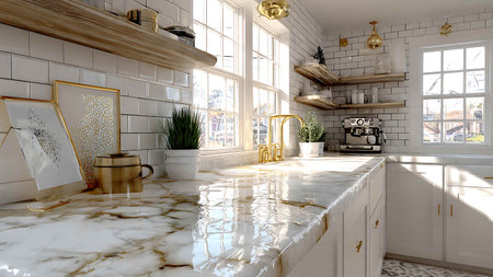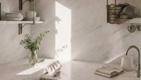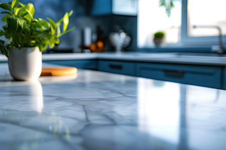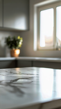 Sunlight filters through a window, illuminating a marble countertop in a modern kitchen, with a potted plant adding a touch of greenery to the space.
