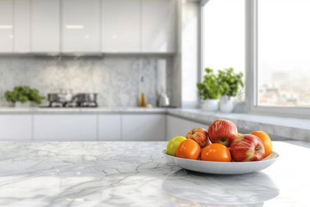 Fruits on white marble countertop in modern kitchen. Close up.