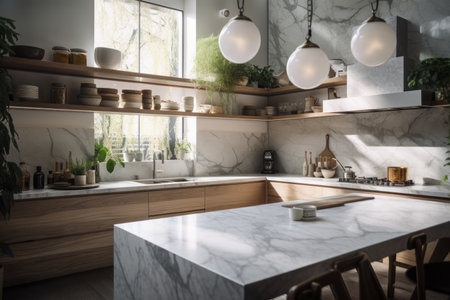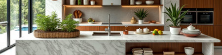 Modern kitchen with marble countertop, wooden cabinets, and indoor plants. That the image is generated using AI.