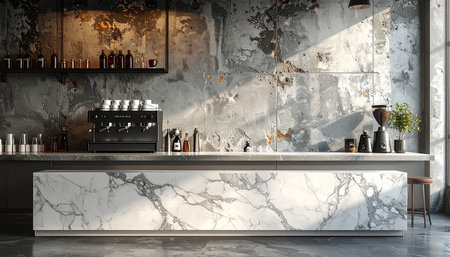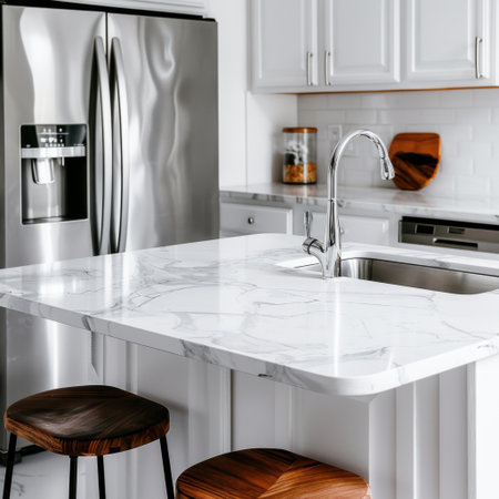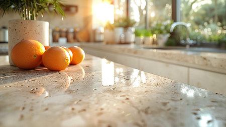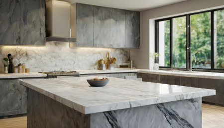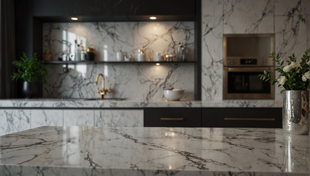 Experience the beauty of this marble granite kitchen counter island showcased in a close-up, ideal for product displays in a modern, bright, and clean space, offering unmatched sophistication