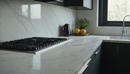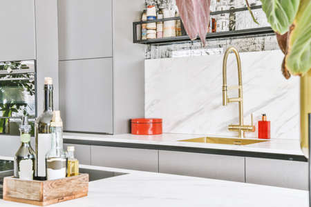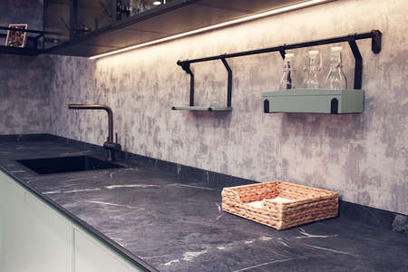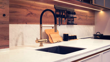 Close up of a modern kitchen interior with a marble countertop.