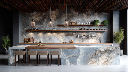 Stylish kitchen with marble countertop, bar counter, and island table in a luxury apartment in the city center, featuring a cave-style interior design. High-angle shot. --ar 5:6 --stylize 750 --v 6.1 Job ID: 0a4e47fd-3b24-4e8a-86ac-9d616df3e57f