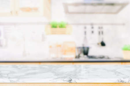 Blurred image of modern kitchen with white marble table and countertop