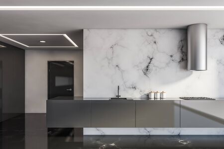 Interior of modern bar with white marble and concrete walls, concrete floor, black and gray countertops with built in sink and cooker. 3d rendering