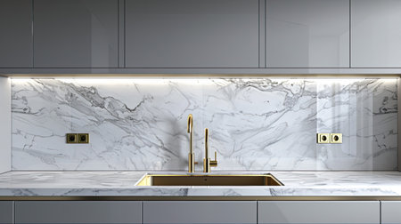 a marble backsplash in an elegant kitchen, illuminated by soft lighting to reveal its natural beauty and texture, complemented by light gray cabinets and a gold sink for added elegance