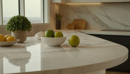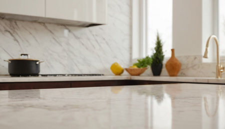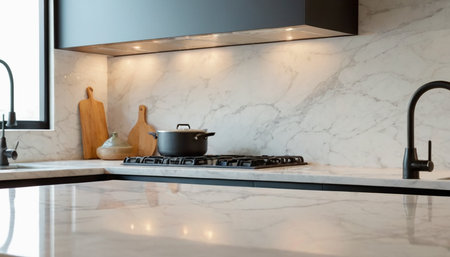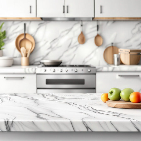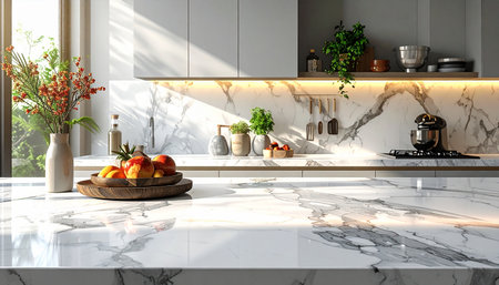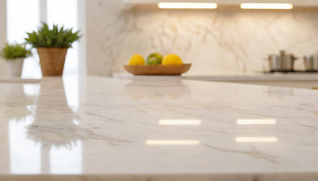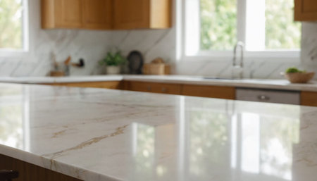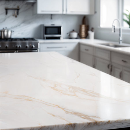 This image showcases a close-up view of a marble granite kitchen counter island in a clean, modern, and bright environment, ideal for product display, interior design inspiration, or kitchen