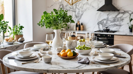 Luxury table setting in modern kitchen interior. Luxury dining room with white marble table.