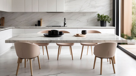 interior of modern kitchen with white marble and beige table and chairs