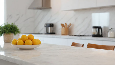 Lemon and apple on white marble countertop in modern kitchen.