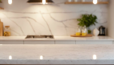 Closeup of white marble countertop in modern kitchen. Blurred background