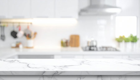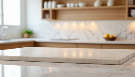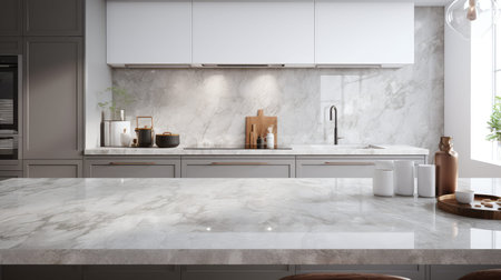 Modern marble white kitchen countertop with mockup space for product display over blurred white marble kitchen interior in the background. 3d rendering, 3d illustration