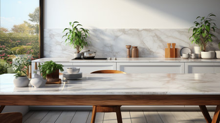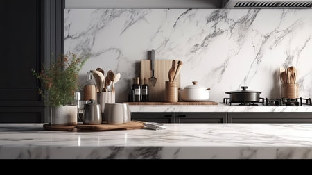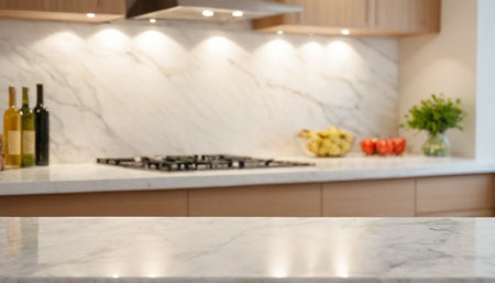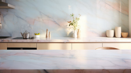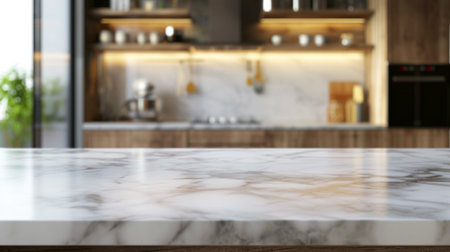 Selective focus, Marble table top on blur kitchen counter (room) background. For montage product display. generative ai.
