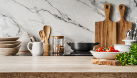 Stylish marble tabletop on wooden platform with copyspace for your logo at blurry kitchen utensils and dishes on light wall background