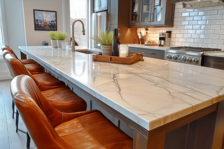 A spacious kitchen features a sleek marble countertop with leather stools lined up at the bar, creating a warm gathering space filled with natural light.