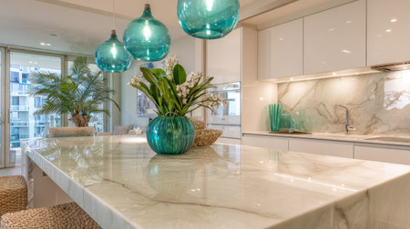 A beautifully designed modern kitchen showcasing a luxurious marble countertop paired with stylish turquoise glass pendants and lush greenery, creating an inviting atmosphere.