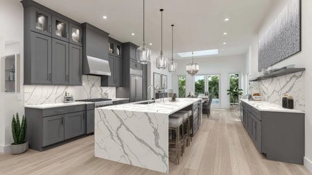 A spacious kitchen showcases a central island and a luxurious countertop, complemented by modern cabinetry. Overhead lighting illuminates the space, featuring a neutral color palette of gray and white. This image could be used for architectural projects or home decor content across various platforms.