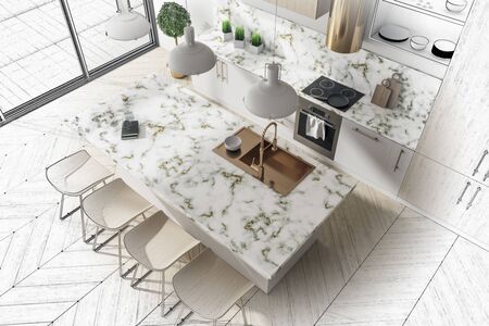 3d Illustration of a modern kitchen in a loft style with a marble countertop