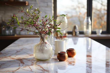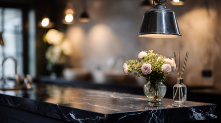 A stunning kitchen scene featuring a stylish counter adorned with a glass vase filled with fresh flowers, enhanced by soft lighting and elegant decor for a warm ambiance.
