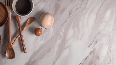 A marble countertop in a high-end kitchen with cooking utensils and ingredients nearby