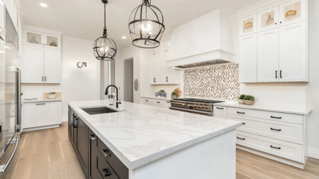 A beautifully designed modern kitchen featuring white cabinets, elegant lighting fixtures, and a spacious countertop, perfect for culinary adventures and gatherings.