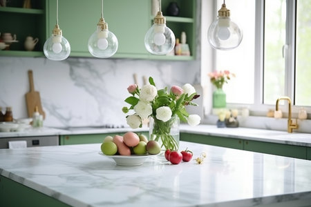 Kitchen with green vintage furniture, marble countertop with flowers and bowl of cherries, bucket with tulips, cupboard with various mugs, crockery and devices. Generative AI
