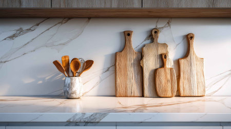 A well-lit interior showcases a contemporary kitchen setup. The focal point is a marble backsplash with dark utensils and wooden cutting boards. Warm lighting creates inviting ambiance. This image is suitable for various commercial purposes, including home decor and lifestyle themes.
