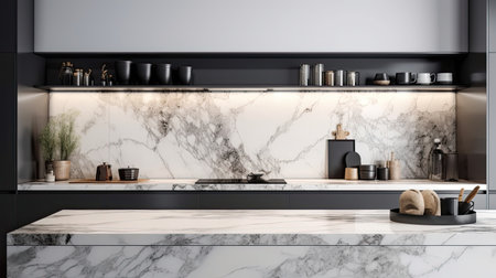 3d rendering of black and white modern kitchen with marble countertop