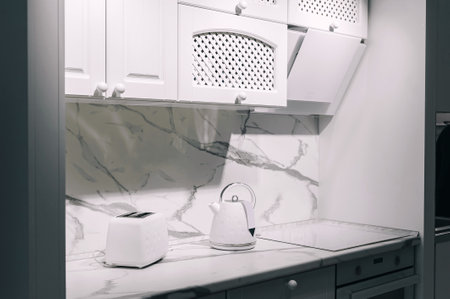 modern white kitchen, showcasing the marble backsplash, white cabinets with decorative lattice, a white toaster, and a white electric kettle on the countertop. The scene emphasizes the clean and stylish design.