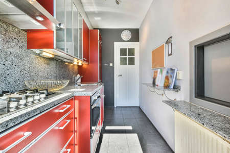 Kitchen interior with the aisle between two worktops, silver sink and amenities