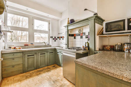 Well organized small home kitchen interior with sink under window and light furniture with stove and fridge in urban apartment