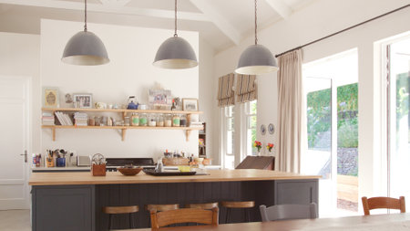 Hanging lamp illuminating with the blurred kitchen background in a modern house or hotel