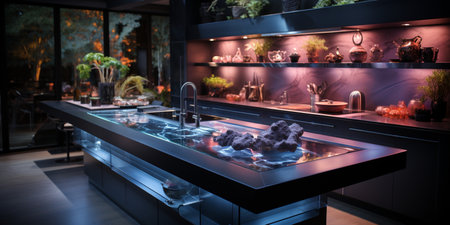 Futuristic kitchen interior with integrated tech and cool lighting