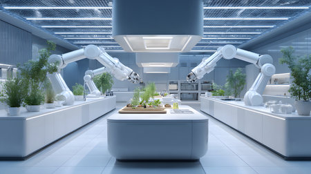 A modern AI-powered kitchen with robotic arms preparing meals in a clean and futuristic space. Ideal for smart home, kitchen tech, and lifestyle content.