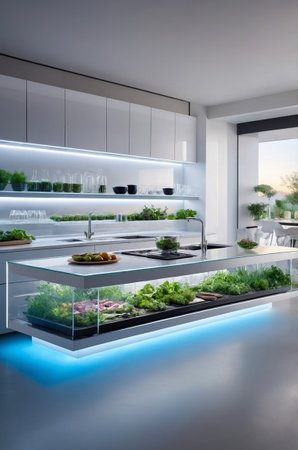Sleek futuristic kitchen featuring a built-in hydroponic garden under the countertop, growing fresh vegetables and herbs. Modern minimalist design, clean surfaces, integrated smart lighting, and eco-friendly living concept. A vision of sustainable technology blending with contemporary lifestyle.