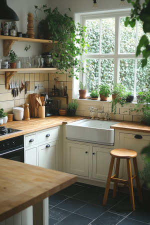 Modern kitchen interior with plants and natural light. Ideal for real estate and contemporary living.