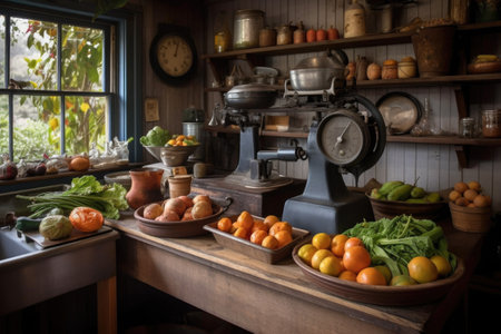 fruit and vegetable stand with old-fashioned scales on the counter, created with generative ai