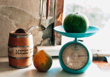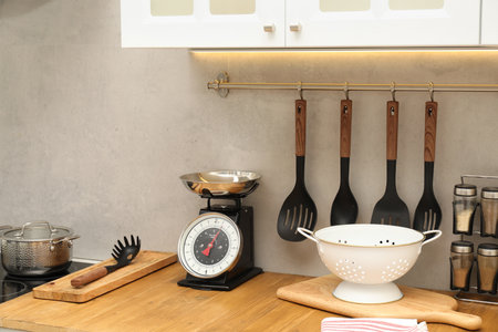 Retro mechanical kitchen scale and other utensils on wooden countertop indoors