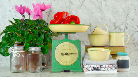 Retro mechanical kitchen scale and other utensils on white marble countertop indoors