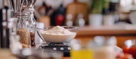 A close-up of a digital kitchen scale measuring out ingredients for a recipe. . --ar 16:7 --v 6.1 Job ID: a445ef8f-a697-4f69-a44c-1b47c792ef8e