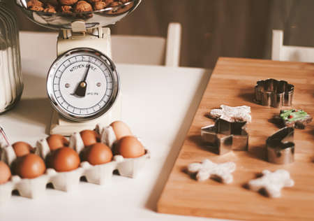 Christmas baking and cooking recipe concept. Food ingredients and preparation process of traditional homemade gingerbread men biscuits in the kitchen at home during winter holidays