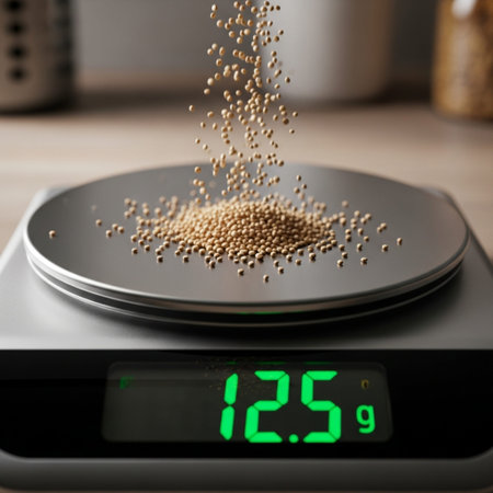 Extreme close-up, centered, capturing the exact moment a precise portion of dried quinoa grains is b