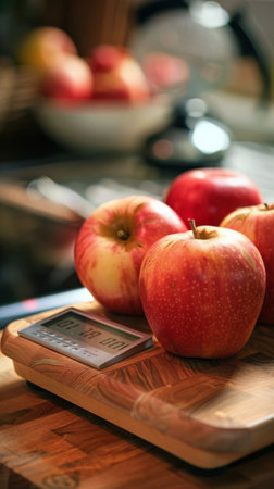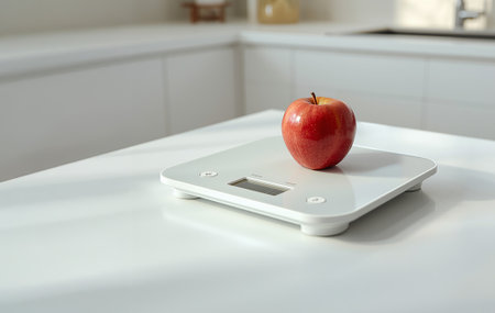 A vibrant red apple rests on a digital kitchen scale, creating a clean and modern food-lifestyle scene.