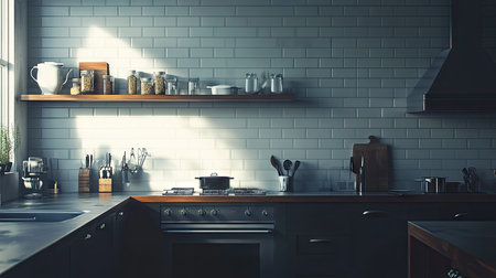 This interior image displays a wooden countertop in front of a white brick wall. Various kitchen items such as jars, utensils, and cutting boards are placed on the countertop. The scene is illuminated by natural light, evoking a feeling of warmth. This image could be used for culinary, lifestyle, or design-related content.
