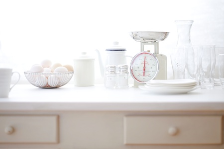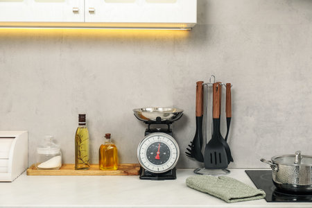Retro mechanical kitchen scale and other utensils on white countertop indoors