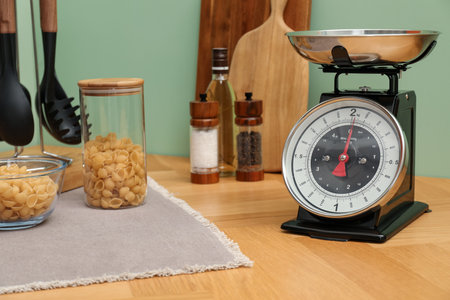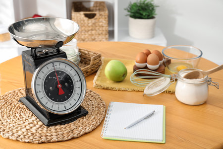 Kitchen scale, products and cooking utensils on wooden table