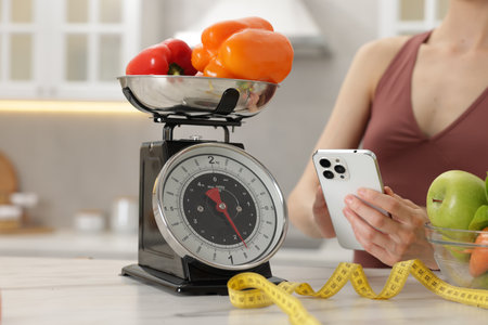 Woman using smartphone near white marble table with kitchen scale, healthy food and measuring tape indoors, closeup