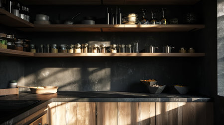 natural lighting illuminating a clean, minimalist pantry, created with generative ai